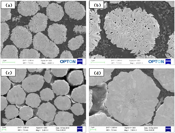 我们利用Ilion II 697精密刻蚀镀膜仪并配备Sigma 500场发射电子显微镜实现对三元前驱体材料的制备及观察。697所制备的粉末样品数量足够多,且表面平整度好,不仅可以看到其内部的孔隙大小、结构情况,还可以看到晶粒的大小和分布情况等。如图2(a)可看出材料整体制备平整、完好无损伤,2(b)可清晰观察到材料内部纳米级别孔隙;图2(c)(d)为另一种结构的前驱体材料,孔隙较小且可观察到晶粒。正所谓“工欲善其事,必先利其器”,选择合适的实验仪器和实验方法能让您的科研达到事半功倍的效果。